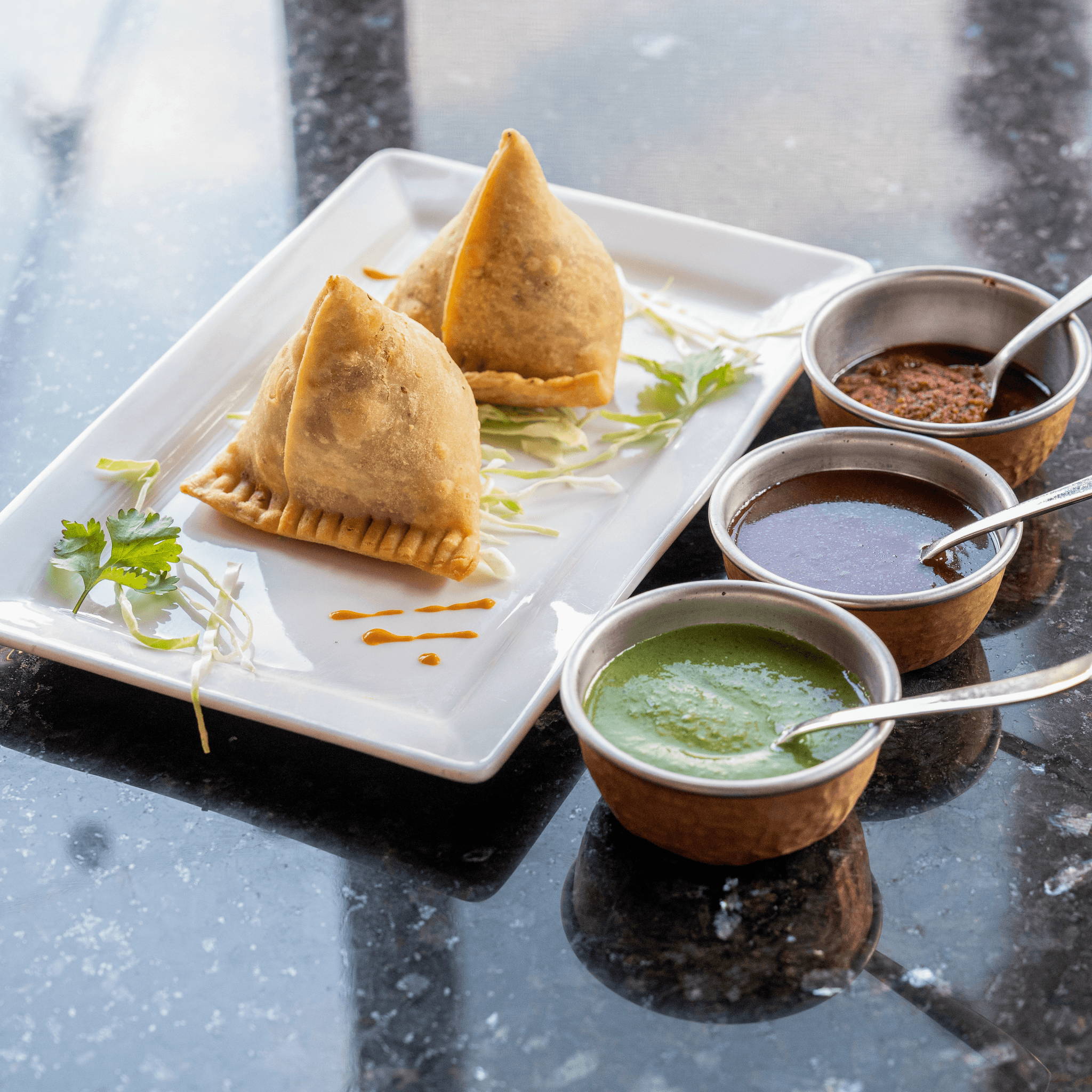 Minced chicken wrapped in a crispy pastry shell - deep-fried and served with chutney.