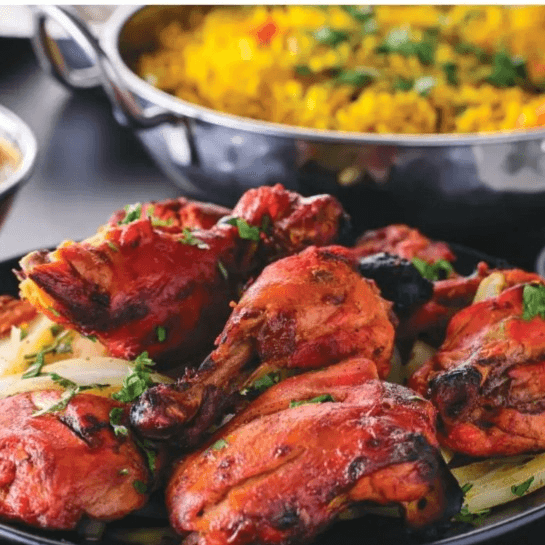 Halved boiled eggs marinated in tikka spices and roasted for a smoky finish. Served with plain white rice