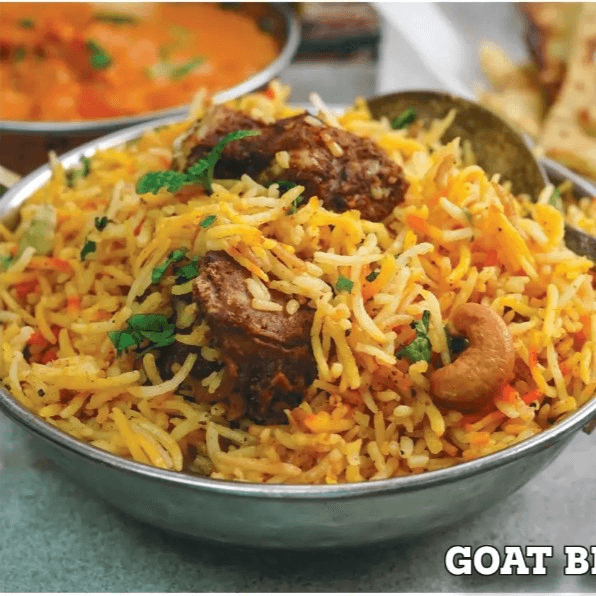 Bone-in goat meat slow-cooked with basmati rice and traditional spices in dum style.