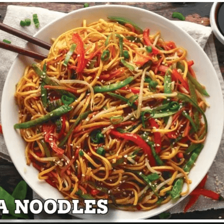 Stir-fried noodles with bell peppers, cabbage, and onions in a savory Indo-Chinese sauce served with your choice of vegetables or chicken.