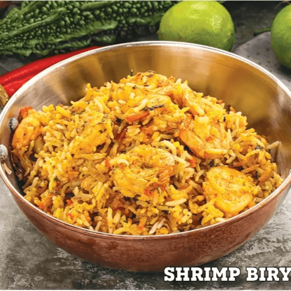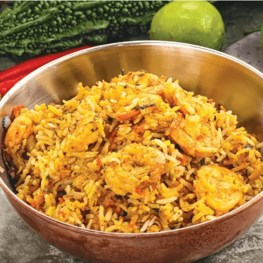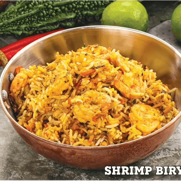 Juicy shrimp marinated with spices and cooked in layered basmati rice over a sealed dum pot.