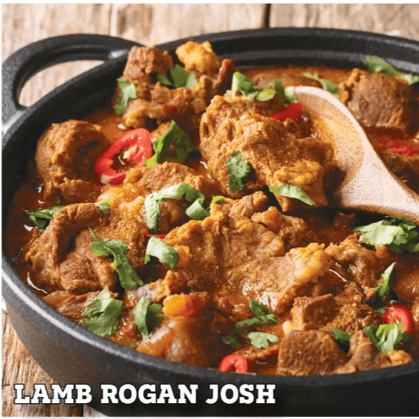 Rich and spicy mutton dish roasted in ghee and infused with fiery red chili paste.