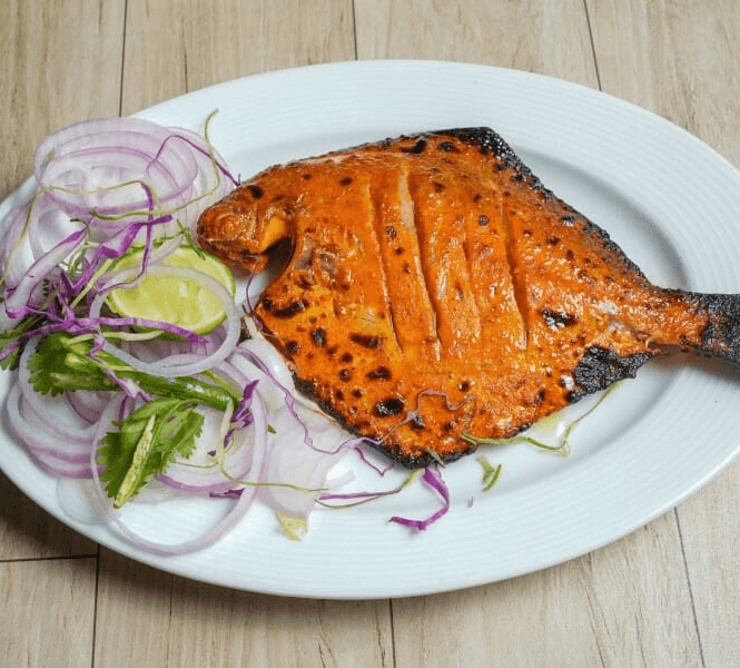 With fish bone. Whole pomfret fish marinated with tandoori masala and grilled over open flames