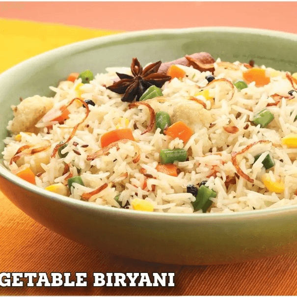Fragrant basmati rice stir-fried with mixed vegetables, soy sauce and Indo-Chinese spices.
