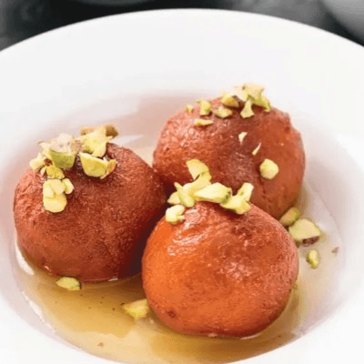 Dark brown deep-fried milk dumplings soaked in rich cardamom sauce.