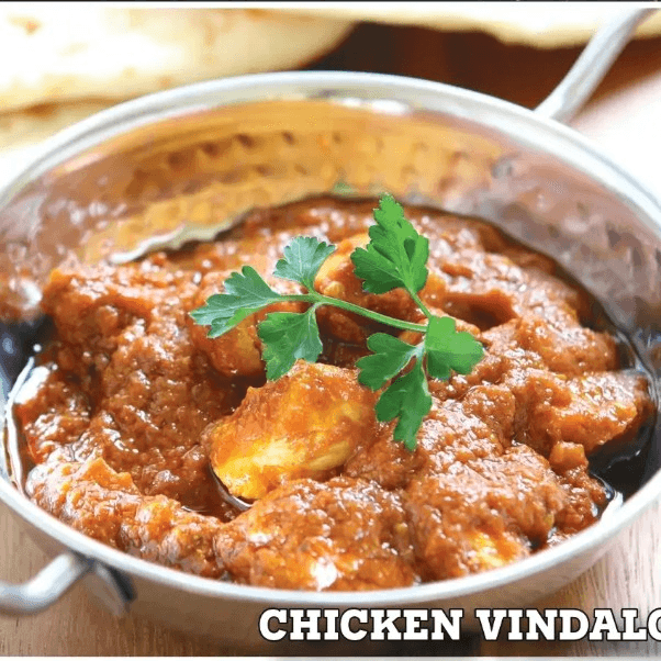 Spicy Goan-style curry with marinated chicken, vinegar, and chilies. Served with plain white rice