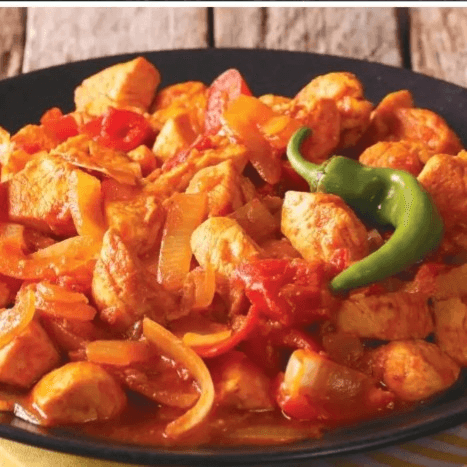 Stir-fried chicken with bell peppers, onions, and tangy tomato-based sauce. Served with plain white rice