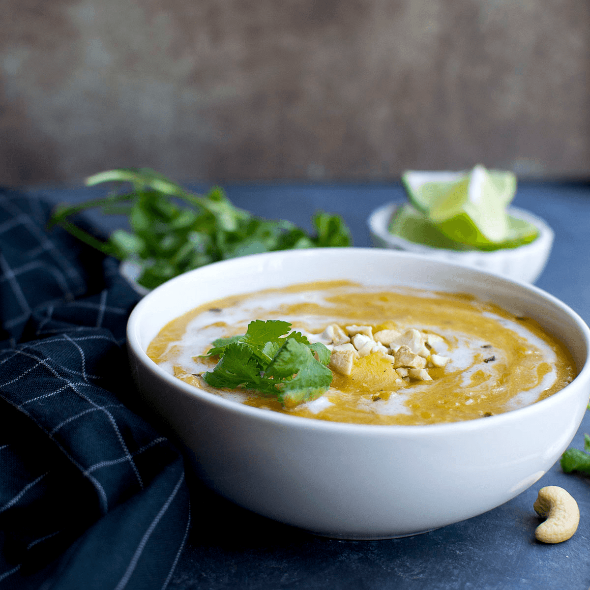 Creamy coconut milk soup with vegetables or chicken subtly spiced. Dairy Free