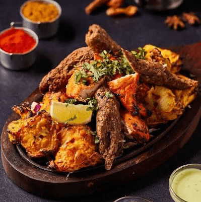 Chicken. A sizzling platter of assorted chicken kebabs, tikka, and wings cooked in the clay oven.
