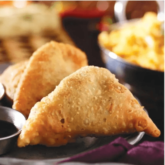 Crispy golden pastry filled with spiced potatoes and peas, deep-fried to perfection.