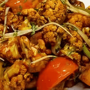 Cauliflower florets battered and fried, then tossed in Indo-Chinese Manchurian sauce.