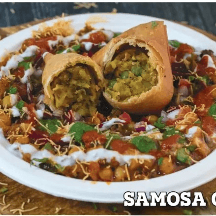 Crushed samosa topped with chickpeas, yogurt, chutneys, onions, and sev - a street-style favorite.
