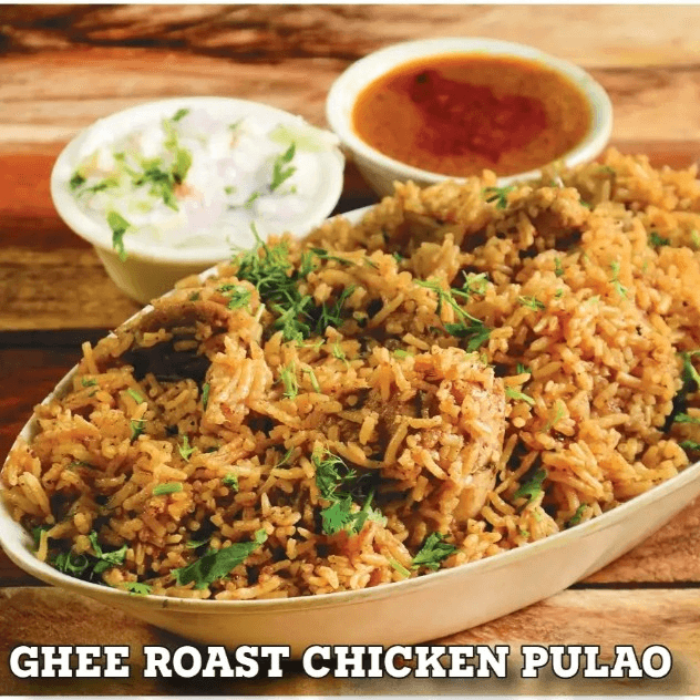 Tender chicken pieces roasted in ghee and blended with spiced pulao rice. Weekends only